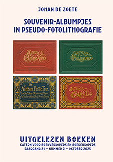 Souvenir-albumpjes in pseudo-fotolithografie Uitgelezen Boeken jrg.21 nr.2 Johan de Zoete € 10 / 25 x 17,5 cm 56 pagina's rijk geïllustreerd genaaid overlijmd ISBN 978 90 83420 53 0 Wellicht hebt u vroeger in een donkere kamer de spanning ervaren om in het rode licht de zelf geschoten foto’s tot leven te zien komen. Al sinds de negentiende eeuw zijn er mensen die sleutelen aan technieken om afbeeldingen zo getrouw mogelijk te kunnen reproduceren. De meeste van die vroege procedé’s zijn in de vergetelheid geraakt. Niemand die het na kan vertellen, behalve natuurlijk... Johan de Zoete. Hij kent niet alleen de theorie maar ook de praktijk, hoe zeldzaam en ingewikkeld die ook moge zijn. De Zoete is één van die mensen waarvan je zijn onmetelijke kennis als hagelslag uit zijn hersenpan zou willen schudden. Een deel van die kennis hebben we gelukkig kunnen opvangen in dit nummer van Uitgelezen Boeken. Wat weet ú van pseudo-fotolithografie? |